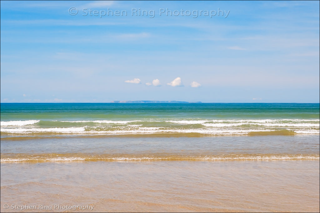 Peaceful waves on the sandy beach at Westward Ho! Clear blue skies on the North Devon coast.