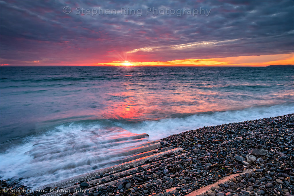 Sunset over Westward Ho! With moody grey skies and a hint of orange on the horizon.   The walkway at Northam burrows with the sea coming over the pebble ridge.