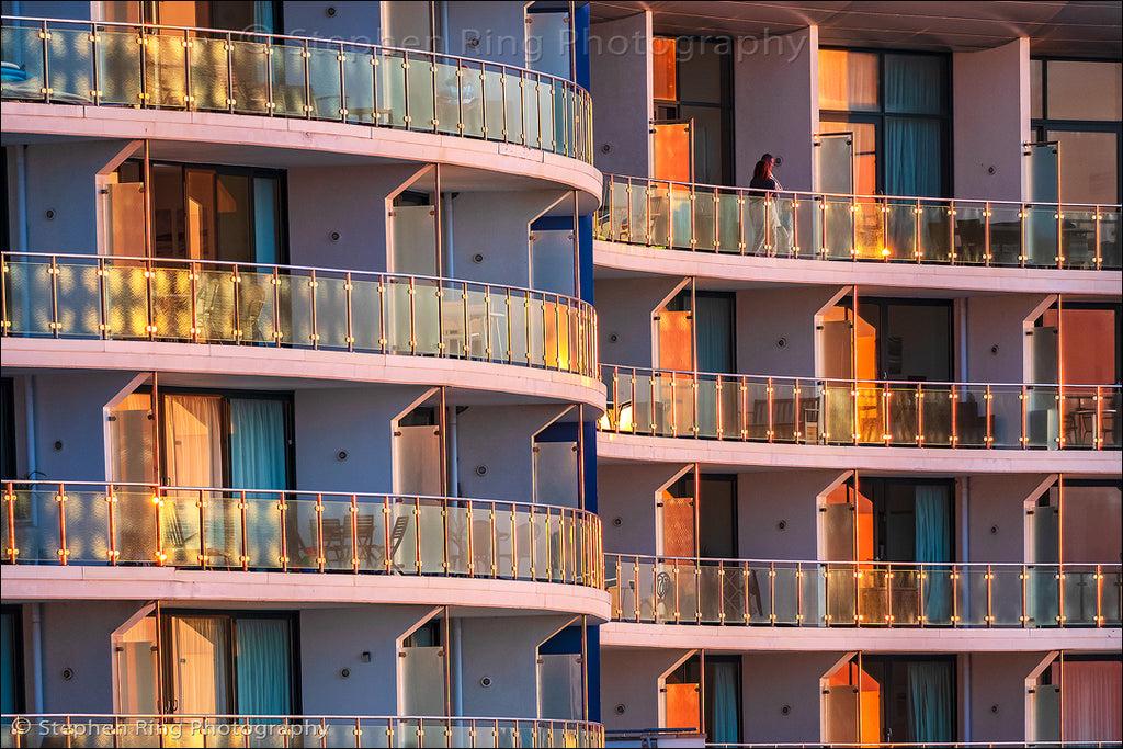 Reflections of the sun in the windows and balconies of ocean view Westward Ho!, repeating patterns.
