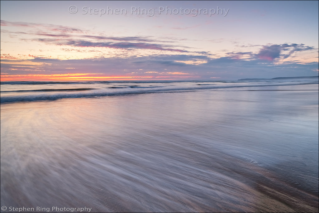 Sultry skies and wet reflections on the beach at Westward Ho! With the sun coming up over the horizon.